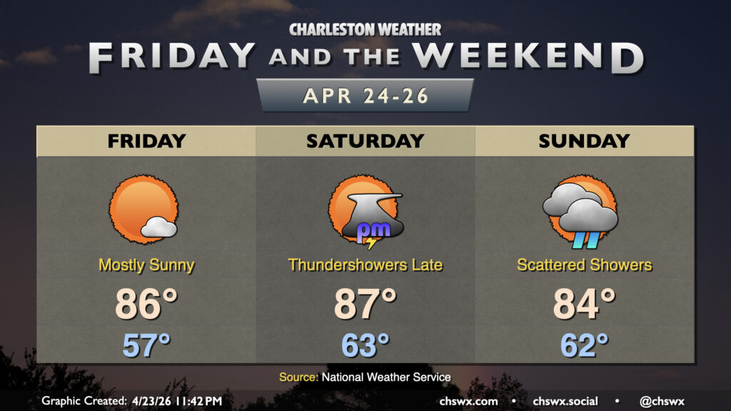 Temperatures Friday and Saturday run in the mid-to-upper 80s in the afternoons after starting in the upper 50s Friday and the low-to-mid-60s on Saturday. From there, a backdoor cold front looks to sink southward across the area on Sunday, which will take temperatures down a few degrees with highs in the low-to-mid-80s expected. With the exception of Monday, though, generally expect warmer-than-normal temperatures to close out April.