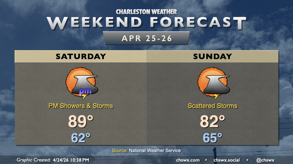 The main weather story for the weekend will be a cold front that’ll move into the area later Saturday, which will help to bring about the first significant rain chance in weeks. A few short-lived seabreeze thunderstorms got close enough to produce a trace of rain at the airport today — the first non-zero rainfall recording at the airport since April 6 — but the unmeasurable sprinkles have kept April 2026’s rainfall total at 0.01″ as we head into the month’s final week, currently in a tie with 1972 for the driest April on record.