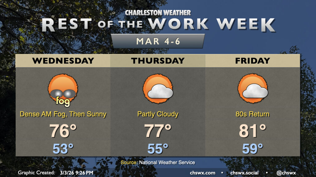 Generally quiet and rather warm weather continues for the rest of the work week. Wednesday morning will likely get off to a foggy start, with dense fog potentially reducing visibility to less than a quarter-mile at times. Use low beams and plenty of following distance in case you do encounter fog. Fog should erode by mid-morning, and we’ll head into the mid-70s under mostly sunny skies in the afternoon.