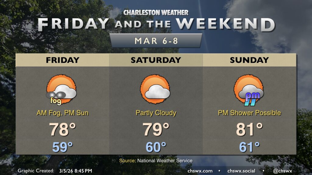 The warm spell peaks on Friday before a cold front affects the area over the weekend. The first 80° day of 2026 is not out of the question on Friday, though a scattering of showers will potentially put a damper on that possibility, especially heading into the afternoon. Like the past couple days, another breezy day looks to be on tap as well, with winds gusting 25-30 MPH at times as the heating of the day helps tap into somewhat stronger winds aloft. As for showers, they aren’t out of the question really at any point in the day, though coverage should increase a bit getting later into the afternoon as the cold front stalls out across the Upstate and Midlands. Not expecting too much in the way of rainfall amounts on Friday, though some brief downpours aren’t out of the question, especially inland from the coast where a little more instability may exist.