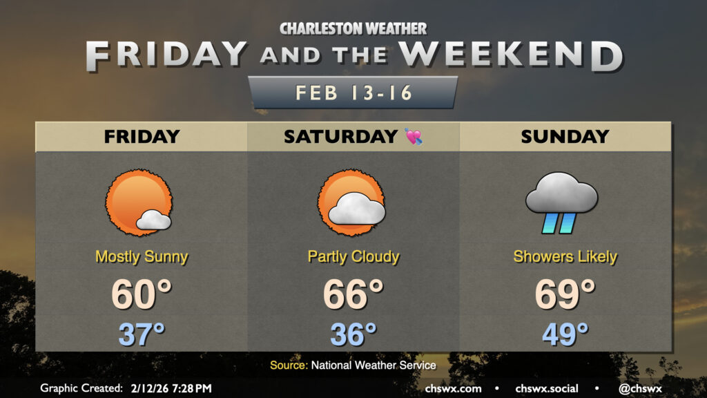 After a front gets through overnight, we’ll turn cooler for Thursday as temperatures head ever-so-slightly below normal. We’ll start Thursday in the upper 30s to around 40°, warming to the low 60s in the afternoon under predominantly sunny skies. While not quite the 70s, it’ll still be a solid mid-February day in the Lowcountry.