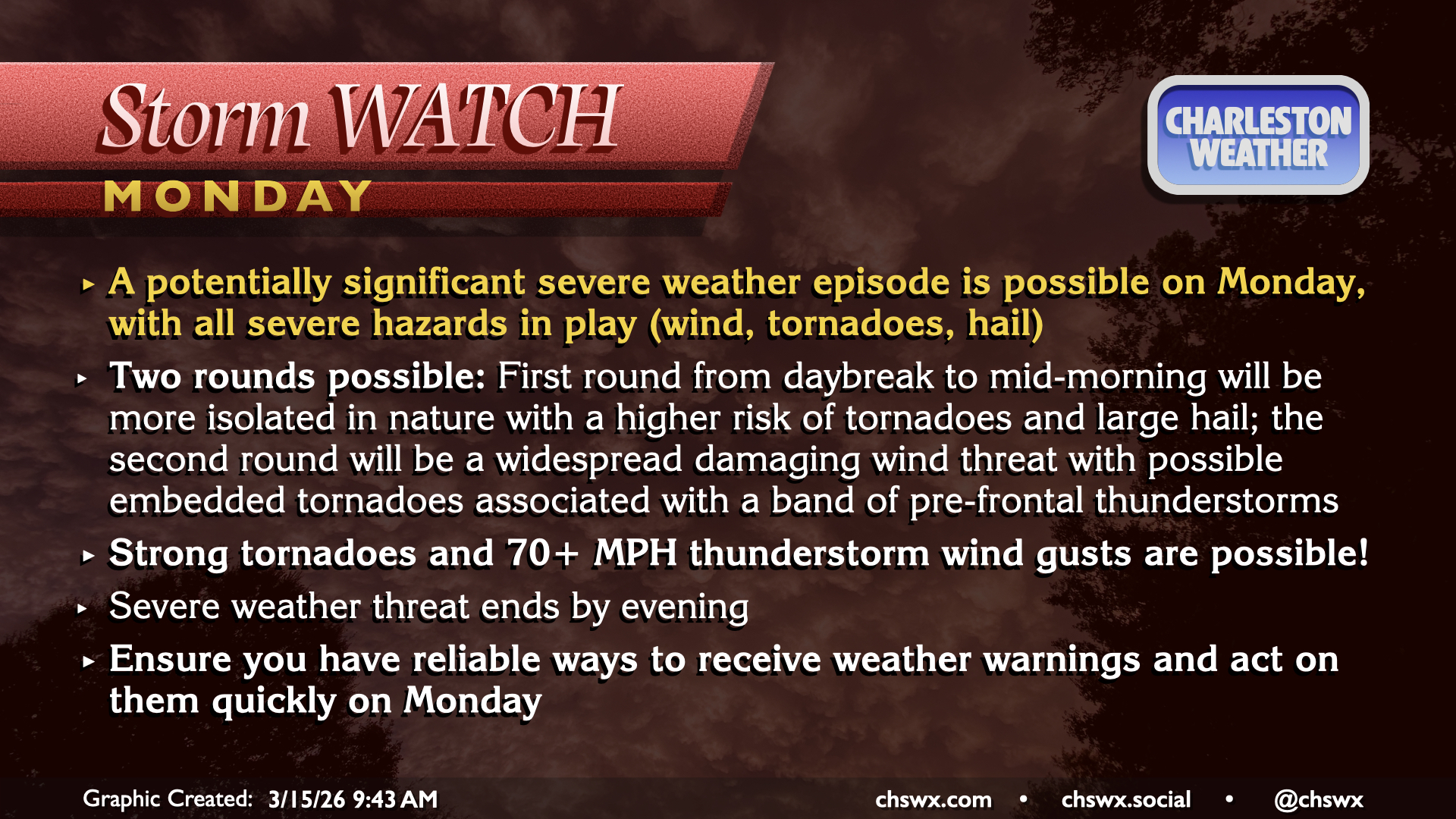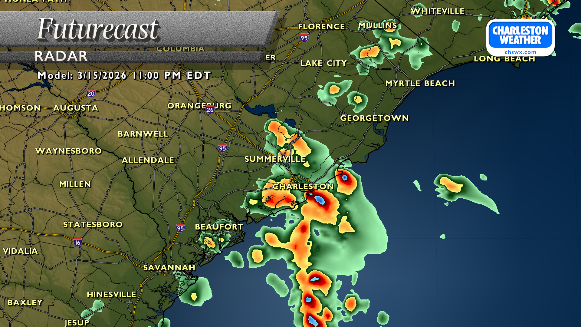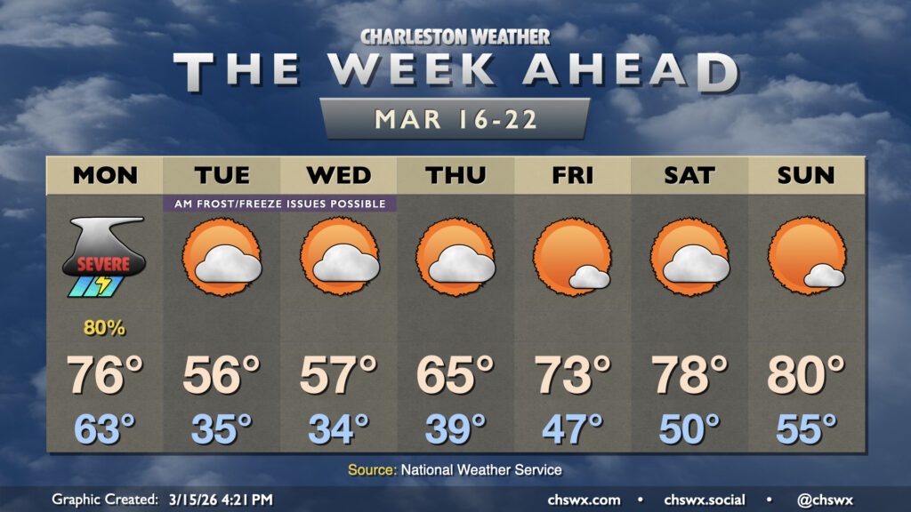 After a new daily record high of 89° was set at the airport on Wednesday, changes are forthcoming as we head into Thursday as a cold front approaches the area. We will start the day quite warm — record warm low temperatures are not out of the question — with lows in the mid-60s at coolest. Temperatures will then head into the mid-70s before a band of showers and thunderstorms approaches the area by mid-morning. Brief periods of heavy rain are possible, but storms will be moving quickly, so no concerns about too much rain in one location. Any rain we can get remains helpful as severe drought continues across the Lowcountry. There could be some thunder, too, and a few strong thunderstorm wind gusts can’t be totally ruled out as the line gets through.