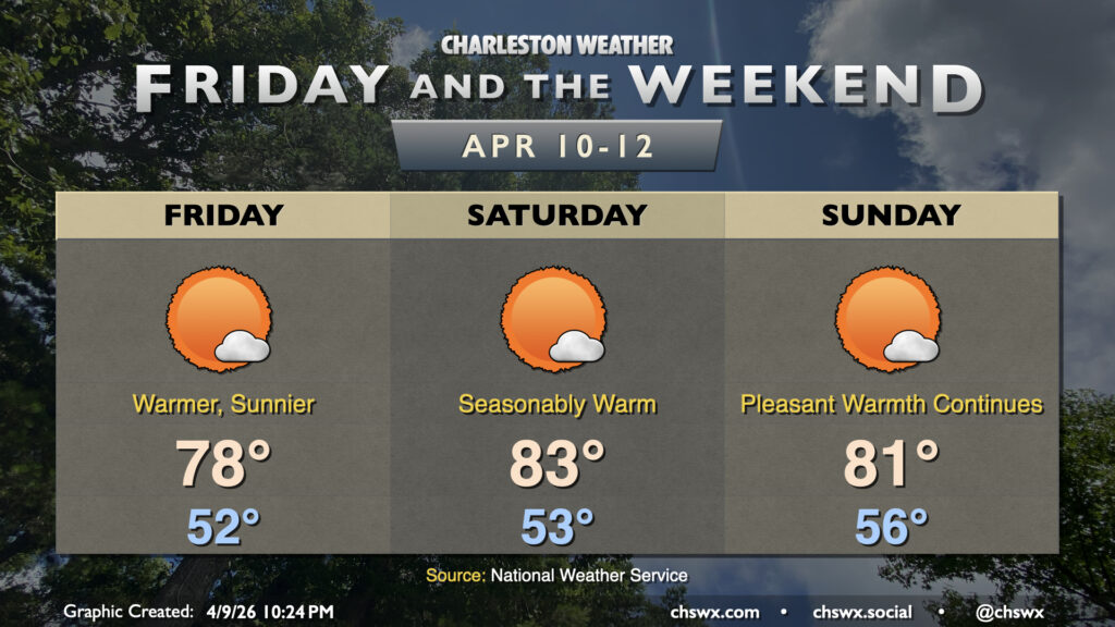 Our brief cooldown comes to an end to close out the work week, with sunshine and 80s returning to the Lowcountry on Thursday. The day starts in the low-to-mid-50s, so you might go for a light jacket to start, but you’ll be able to shed that by mid-morning as temperatures climb. Highs peaking around 80° run a few degrees above normal for late March. Winds are quiet to start the day but pick up a little as the seabreeze pushes inland later in the day.