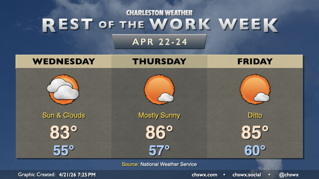 After a couple cooler days, the 80s return to the Lowcountry starting Tuesday and lasting well into the beginning of April. High pressure remains the main weather feature, keeping us generally on the quiet side. A southerly breeze around 5-10 MPH will be common, especially as we get into the afternoon. Thankfully, some higher dewpoints will also continue to put a dent in the fire danger.