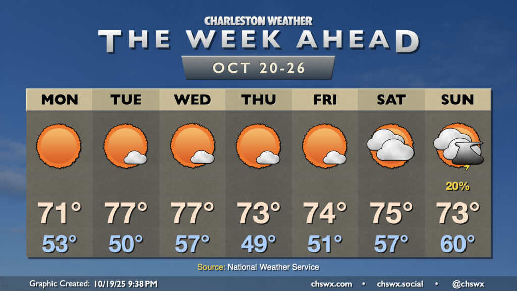 A front which helped stir up another round of heavy rain and flooding in downtown Charleston on Sunday will clear the area overnight into early Monday, yielding a week of comfortable temperatures with occasional slight shower and storm chances.